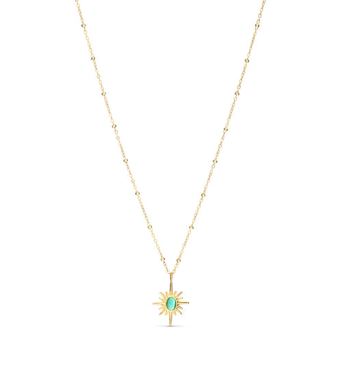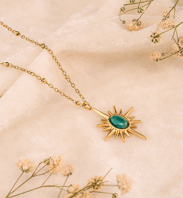 Radiate confidence and charm with the Golden Sunburst Green Stone Pendant Necklace. Designed with a striking sunburst motif, this pendant features a vivid green gemstone at...