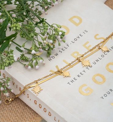 Shine with effortless elegance wearing the Sunburst Charm Bracelet. Designed with a sleek gold-tone chain, this bracelet features delicate sun-inspired charms that symbolize positivity, energy, and...