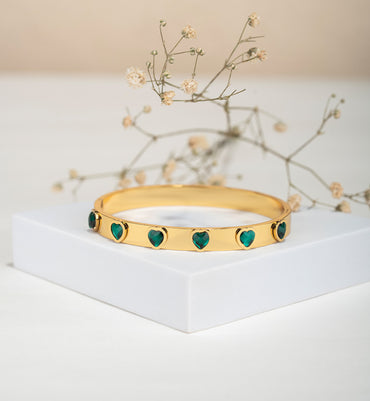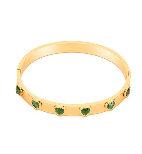Celebrate love and elegance with the Emerald Heart Charm Bangle Bracelet. This stunning gold-tone bangle is beautifully adorned with a series of deep green heart-shaped stones,...